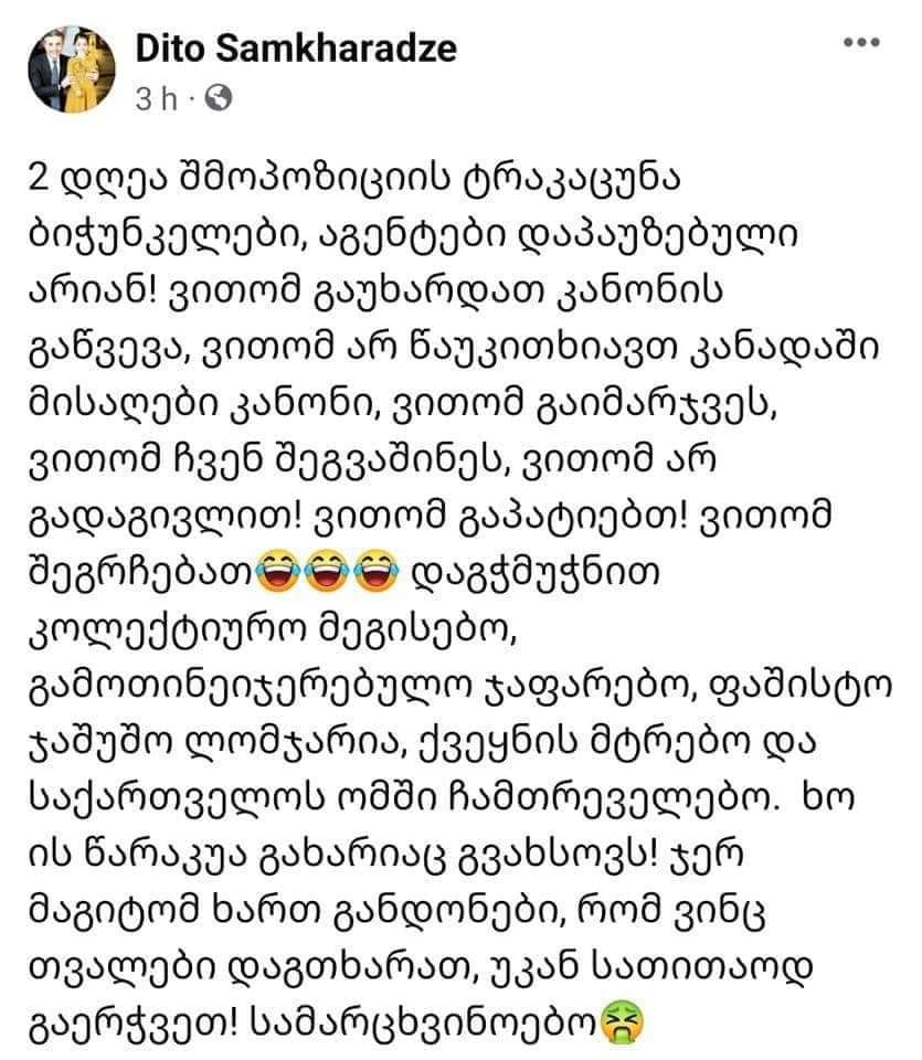 უმრავლესობის დეპუტატის ფეისბუქ პოსტი, "მადლობას გადაგვიხდით რომ არ დაგხოცეთ"