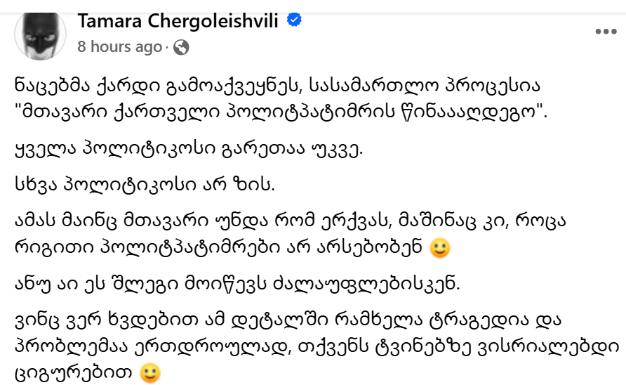 გახარია? ლელოსთან კოალიციით ბევრ კითხვას გაეცემოდა პასუხი მაგრამ ჩაისვარა მაგ ამბავმა. მაგ დროსაც დავწერე და ეხლაც დავწერ - 20 ივნისზე თუ პასუხს არ გასცემს, ჩემთვის ის ვერასდროს გახდება სანდო. დანარჩენ კითხვებზე ასე თუ ისე ლელოსთან ხვანცალმა გასცა პასუხი. შეერთებას ხელი შეუშალა კვოტების ამბავმა და ამიტომაც ვწერ რომ სხვა კითხვები ასე თუ ისე პასუხგაცემულია ჩემი აზრით.