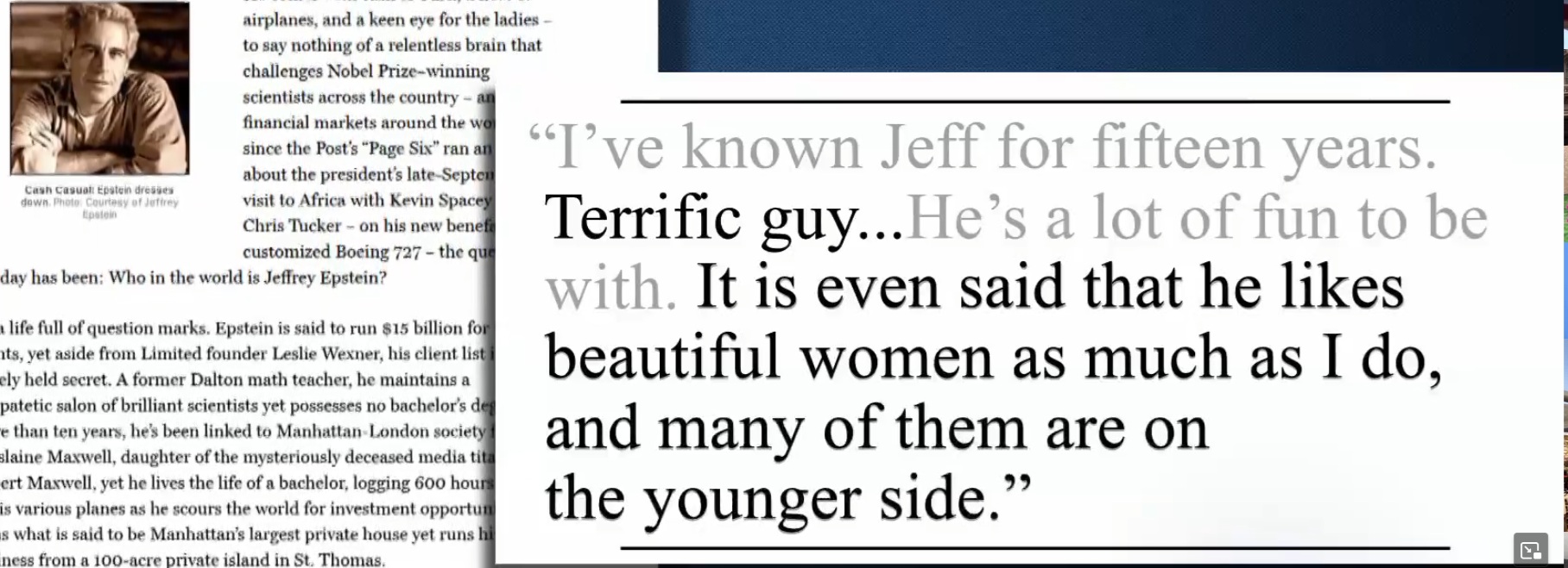 E. Jean Carroll – late 1995 or early 1996. Story in NY Magazine June 21 and expected in upcoming book.