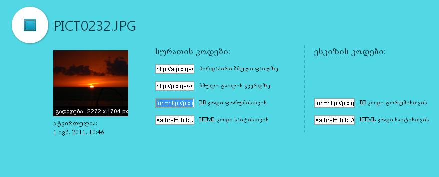 იქნებ მასწავლოთ როგორ დავდო სურათი,პირდაპირ რომ გამოჩნდეს,pix.ge ზე ყველა ლინკი დავაკოპირე რაც იყო მაგრამ მაინც არ ჩანს