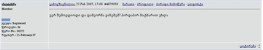 ამ ფორუმელის პოსტინგები გაქვთ იგნორირებული, ნახვისთვის დააწკაპუნეთ აქ
