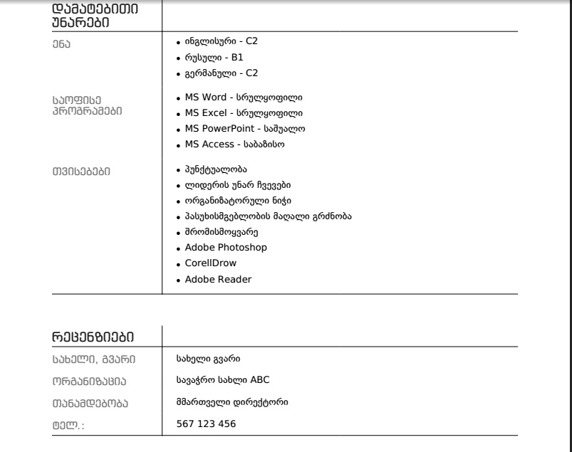 CV ფორმა მოსახერხებელია და დალაგებული ზომებში.