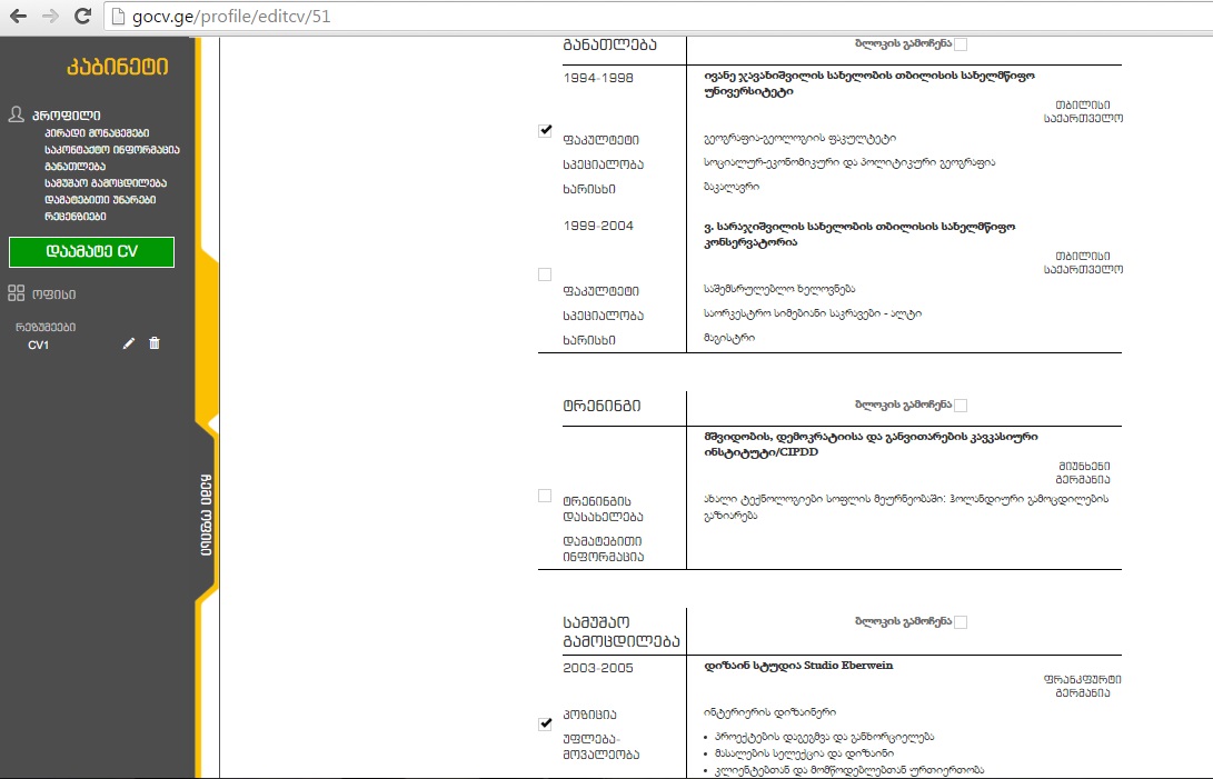 http://gocv.ge/files/CV%20%E1%83%A4%E1%83%...1%83%90%20B.pdfდიპლომის მიწეპებას, ჩახატვას და ა.შ. არ ვითხოვთ, საიტს არ აქვს "აუცილებელი" ველები, მომხმარებელი თვითონ წყვეტს რა ჩაწეროს და რა ატვირთოს.