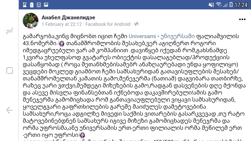 იქნებ დაგეგმილი აქვს ადამიანს რამე საქმე, მიდის ვინმესთან, ან ქალაქგარეთ ან სულაც ქვეყნიდან და უცებ ურეკავ, მოდი საქმე გავარჩიოთო. რატომ უნდა გადადოს პირადი გეგმები? აქ ლაპარაკი არაა რამდენიმეათასიან ღრმადსაპასუხისმგებლო სამსახურზე, 500 ლარზეა ლაპარაკი თვეში და კიდევ დასვენების დღეც არ შეარგო??
