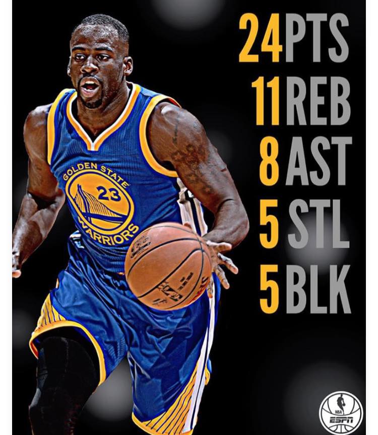 Draymond Green: First player since Hakeem Olajuwon (Dec. 30, 1993) with at least 20 pts 10 rebs 5 ast 5 stls 5 blks