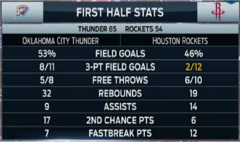 მოკლედ 65:54 და პირველად წელს ოკლამ პირველ ნახევარში 60+ ქულა აიღო.