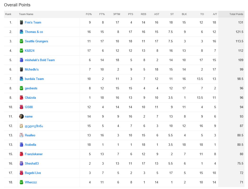 1. Frm's Team 2. Thomas & co 3. Seattle Grungers 4. K&B24 5. mishelak's Bold Team