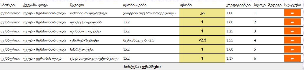 403 27/07/10 21:00 ფეხბურთი ლიტექსი(ბულ)-ჟილინა(სლვკ) 1 1.65