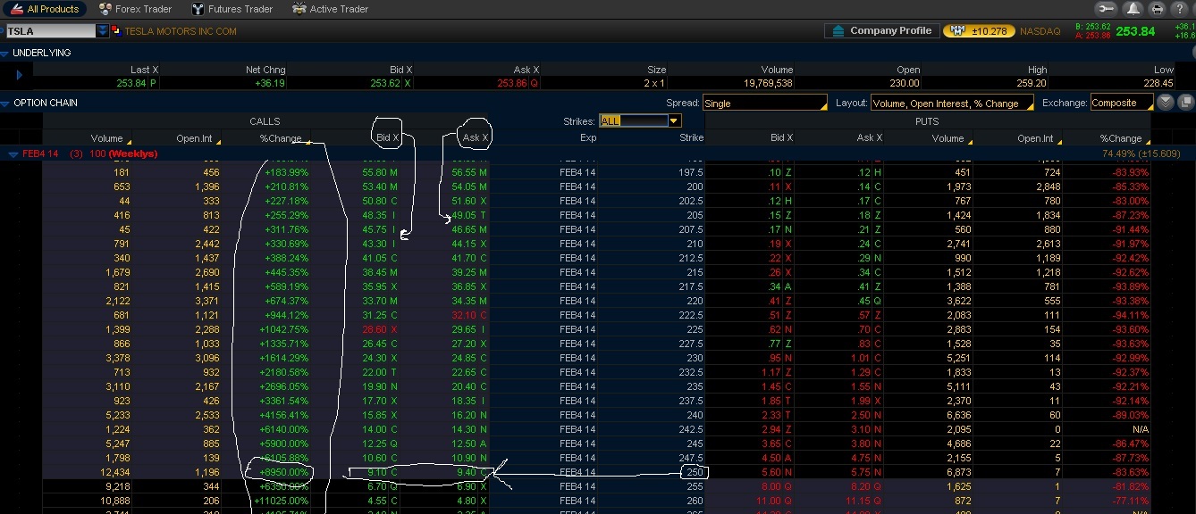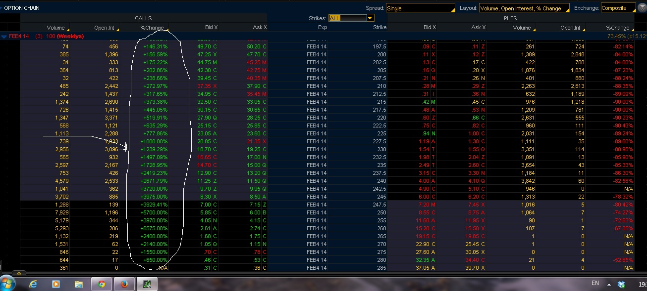 ამ სურათზე ჩნს რომ მაგ თებერვლის 250 სტრაიკი ეხლა ღირს 6 დოლარი ( ბიდ ასკს დააკვირდით ) და ეს არის 5700% იანი ზრდა გუშინდელი ფასის ჩვლილება ანუ 100 დოლარი გუშინ ეხლა იქნებოდა 5700 დოლარი