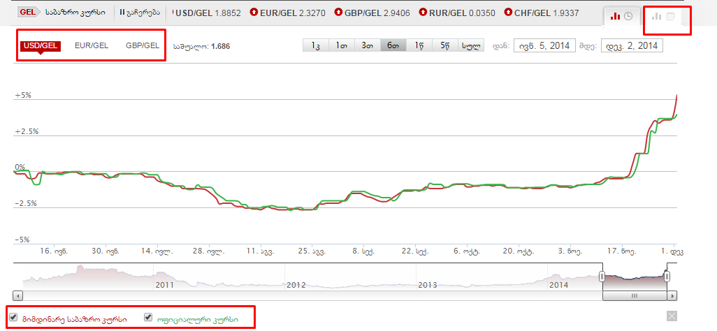 ლარის საბაზრო და ოფიციალური კურსის ცვლილების დინამიკა შეგიძლიათ იხილოთ ჩვენს საიტზე: