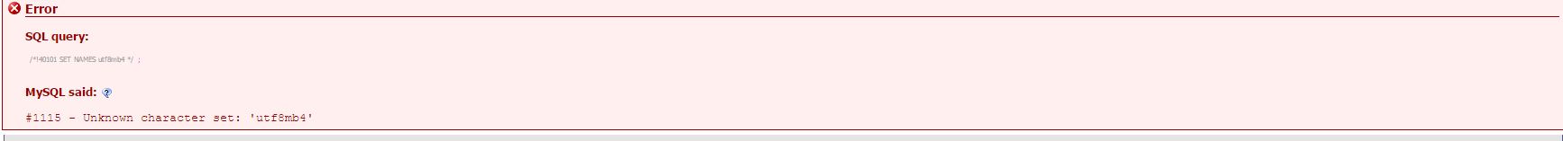 სანამ ბაზას ატვირთავ, გახსენი ნოუთპად++ ით და შეცვალე. 'utf8mb4'-ის ნაცვლად ჩაწერე utf8.