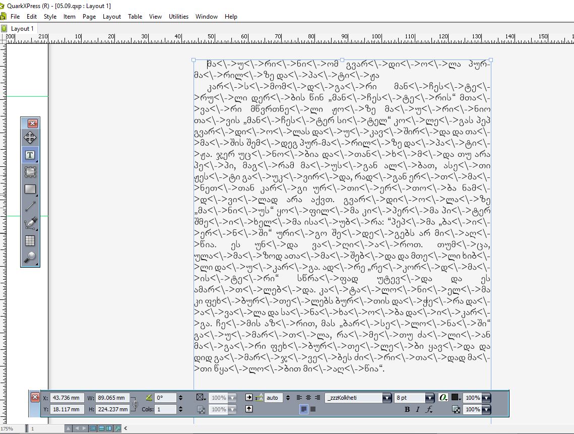 საბეჭდად ვიყენებთ კოლხეთის ისეთ ფონტს, რომელიც სტანდარტულ ლათინურ განლაგებას არ ექვემდებაზება და საჭიროა დამატებითი დრაივერის დაყენება. ვთქვათ ჩვეულებრივ აკადნუსხს მარცვლავს, მაგრამ როგორც კი ცემი ტექსი ამ კოლხეთში გადამაქვს და ვამარცვლინებ, xtg ფაილში გამოაქვს ასეთი ლეღვობა