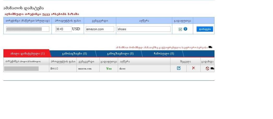 ეგ ვიცი ნივთის დამატება უბრალოდ 2 ნივთს ერთი და იგივე Tracking Number აქვს და დეკლარირებას არ მაკეთებინებს