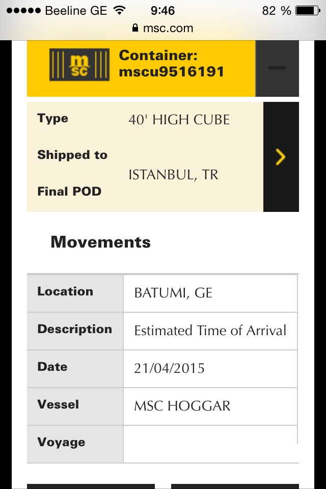 mscu9516191 ამ კონტეინერზე არ მაჩვენებს ინფორმაციას, ხო ვერ მეტყვით ბათუმში როდის იქნებააა???? ფლიზ.