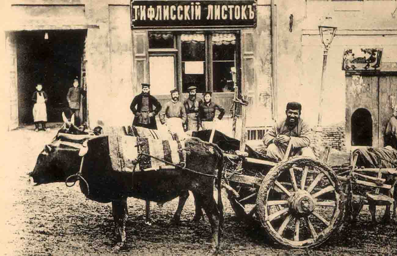 Street scene showing muddy street, buildings, and children gazing from balcony in Tbilisi (aka Tiflis), from unidentified Briton's personal photo album.