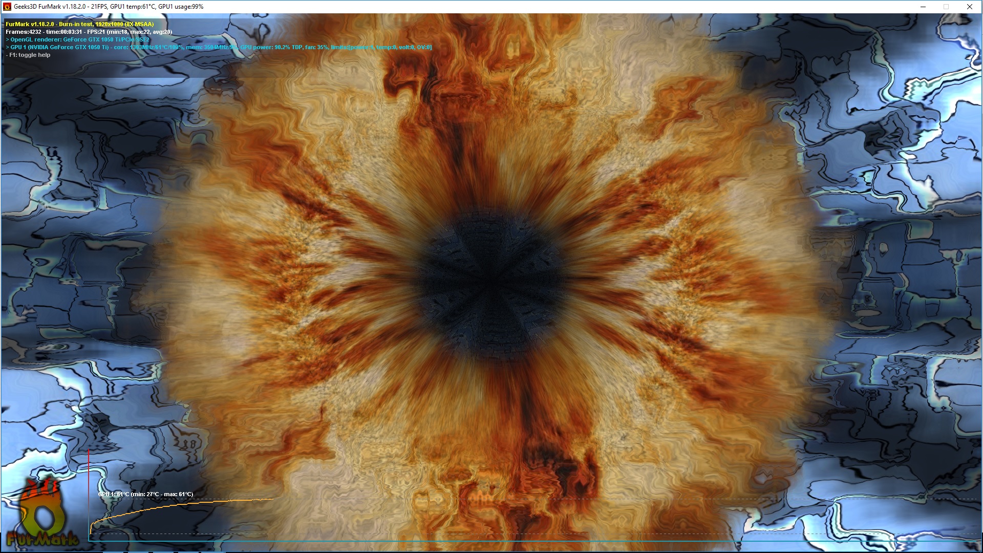 მაქსიმალური ტემეპრატურა ფურმარკში 61 გრადუსი post fx და xtreme burn in ჩართული იყო, 3.5 წუთი მქონდა ჩართული ფურმარკი