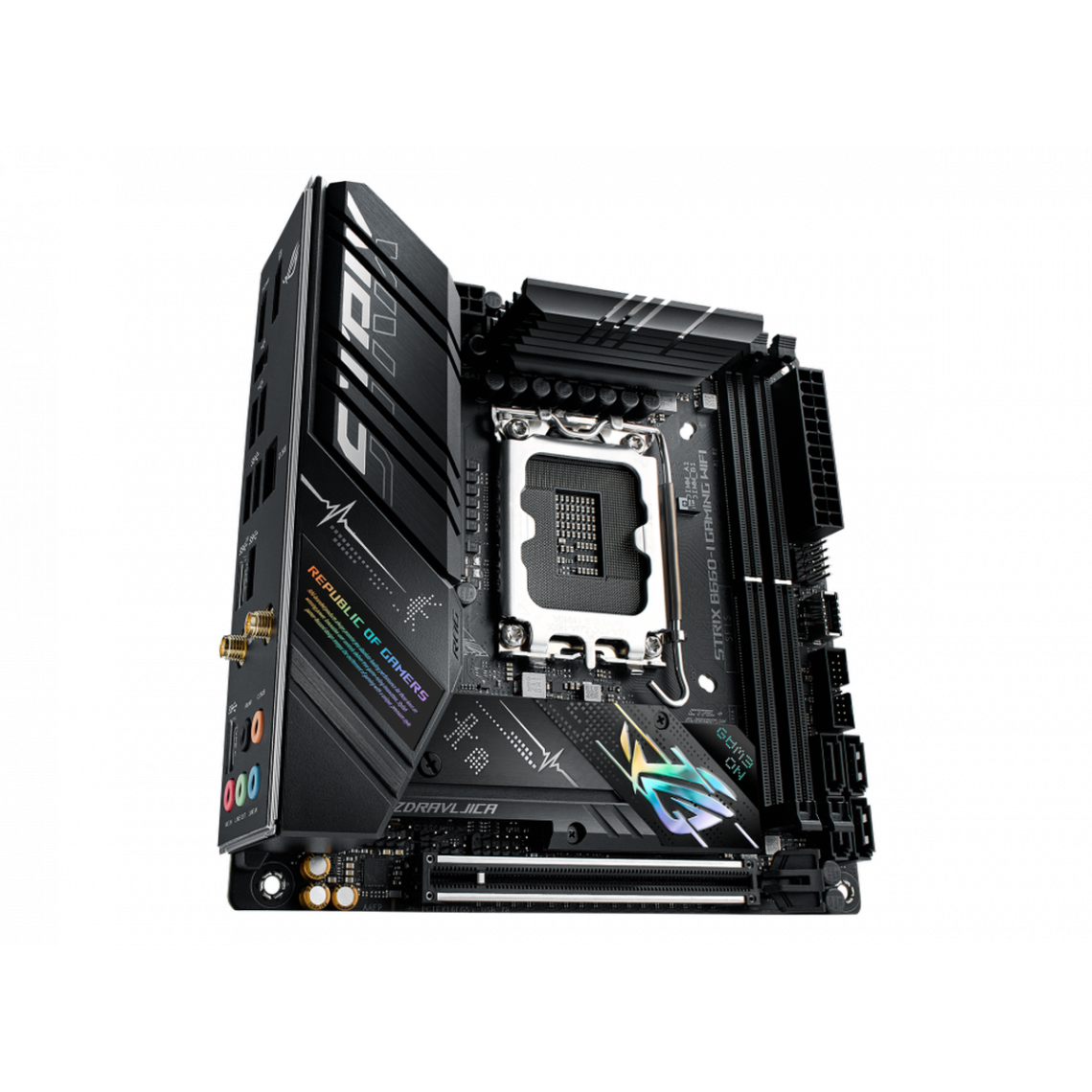 Intel® B660 LGA 1700 ITX motherboard with PCIe® 5.0, 8+1 power stages, DDR5 memory support, ASUS Enhanced Memory Profile, Two-Way AI Noise Cancelation, AI Cooling, AI Networking, WiFi 6 (802.11ax), Intel 2.5 Gb Ethernet, two PCIe 4.0 M.2 slots, USB 3.2 Gen 2x2 Type-C®, SATA and Aura Sync RGB lighting
