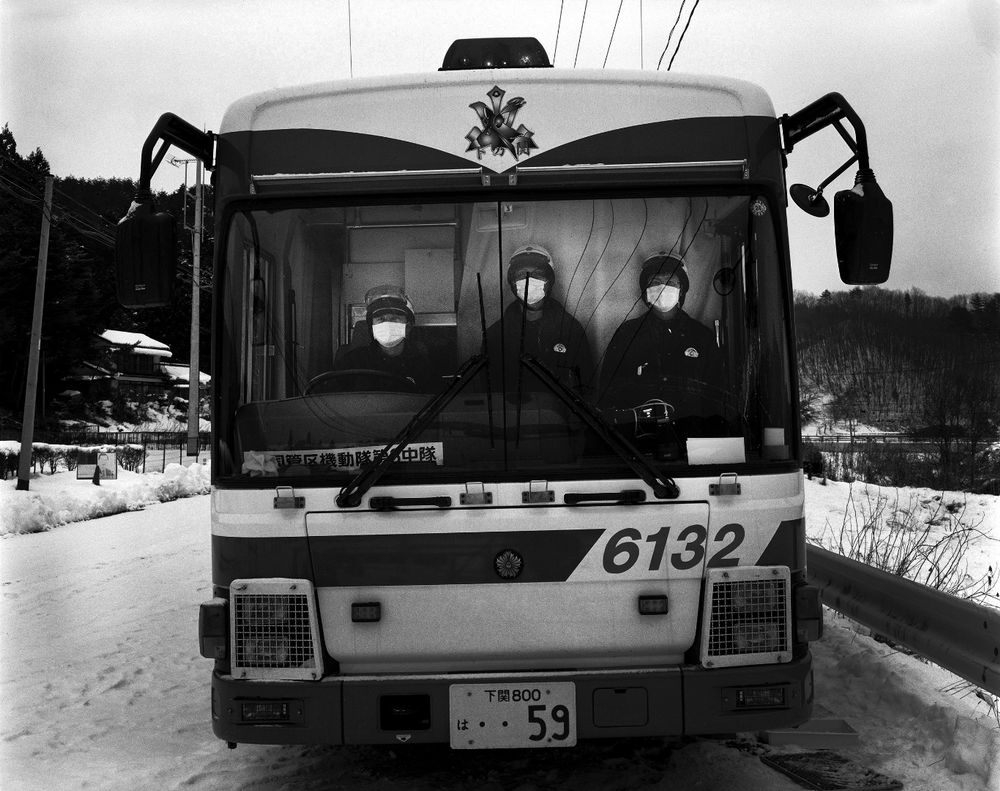 Three police officers at the checkpoint of Tsushima district, 27 km from Fukushima.
