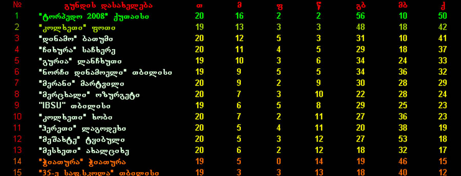 "ტორპედო2008" ქუთაისი ?-? "დინამო" ბათუმიპირველი წრე 3 ოქტომბერი: "დინამო" ბათუმი 0-1 "ტორპედო2008" ქუთაისიგატანილი გოლი შეგიძლიათ იხილოთ აქ: