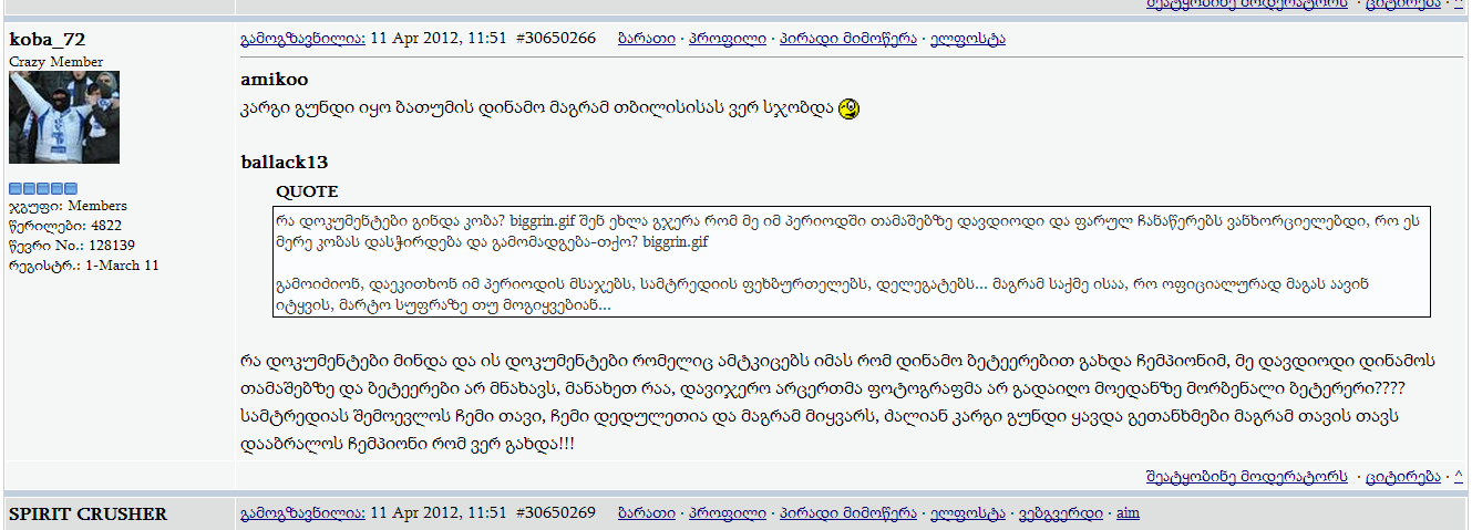 dima z3stafanკარგია რომ იცი. დინამოზე როცაა რამე სათქმელი ისევე ვამბობ როგორც თქვენზე და პეტრეზე და პავლეზე.. ფიფიაზე როცა რამეა სათქმელი იმასაც ყოველთვის ვამბობ გეცოდინება შენ. და ახლა ჩემს აზრს რომელ თემაში დავაფიქსირებ მემგონი ამაზე არ მგონია ვინმესთან მქონდეს კონსულტაციები გასავლელი