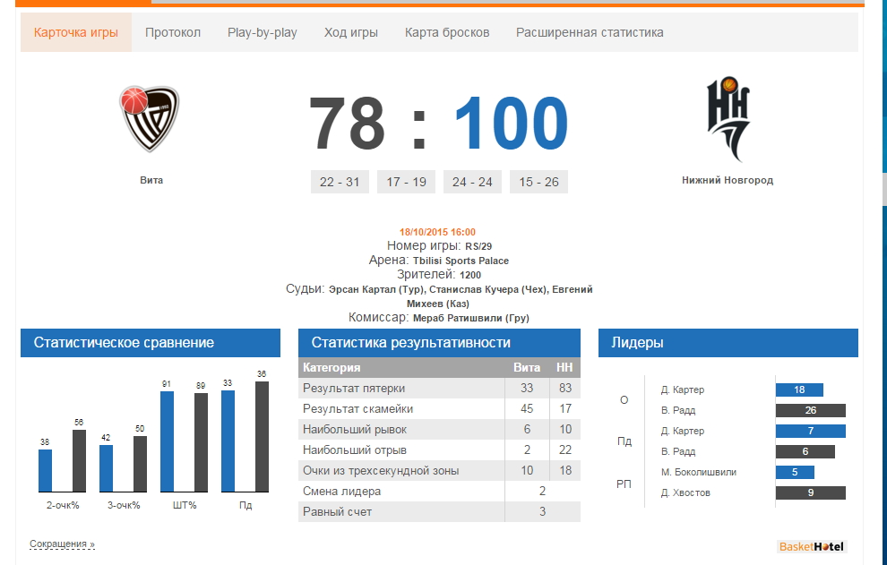 Гооге не просто так говорил о возрастающей уверенности своих подопечных. Баскетболисты грузинской команды с самого начала принялись достойно отвечать на атаки оппонента, однако за счет опыта «Нижний Новгород» все-таки захватил инициативу. Двузначное преимущество, созданное четырьмя подряд трехочковыми и вездесущим Виктором Раддом, сохранялось на протяжении всей первой половины.