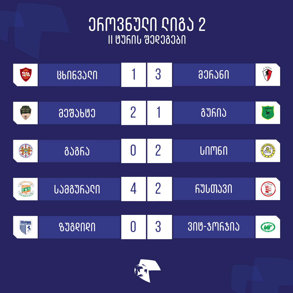 ტურის ბოლო შეხვედრა ზედა ეწერის ცენტრალურ სტადიონზე გაიმართა. „ზუგდიდმა“ „ვიტ-ჯორჯიას“ უმასპინძლა და 3:0 დამარცხდა. ვეტერინართა მხრიდან ჰეთ-თრიკი ზურაბ ღირდალაძემ შეასრულა. შემტევმა მე-8, 45-ე და 55-ე წუთებზე გაიტანა. თბილისურმა კლუბმა ეროვნული ლიგა 2-ის გათამაშება შესანიშნავად დაიწყო, საწყის ორ ტურში თენგიზ კობიაშვილის გუნდმა ექვსი გოლი გაიტანა, არც ერთი არ გაუშვია და მოპოვებული ექვსი ქულით პირველ ადგილზეა.