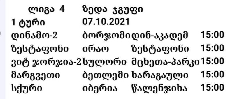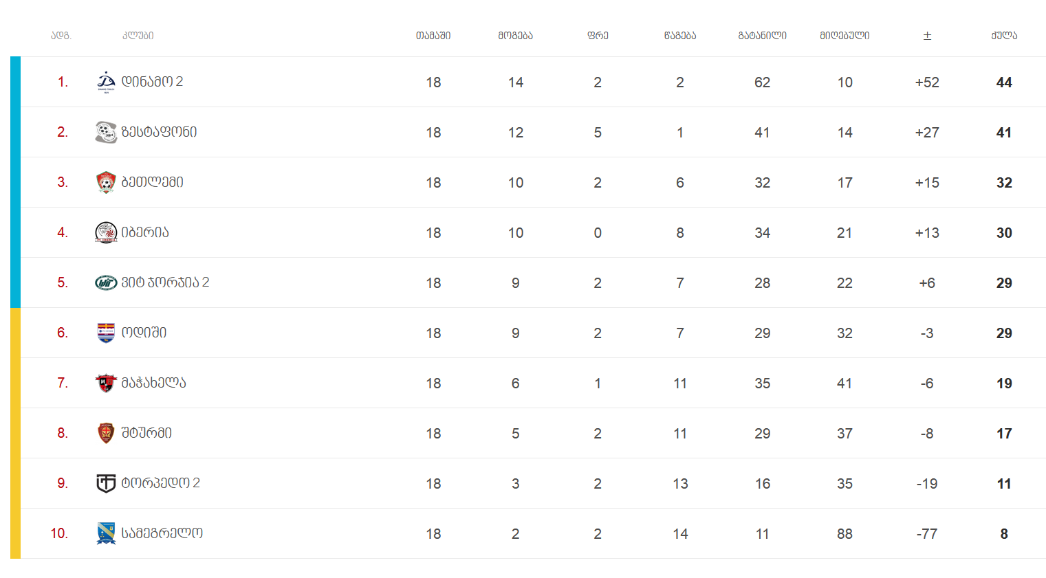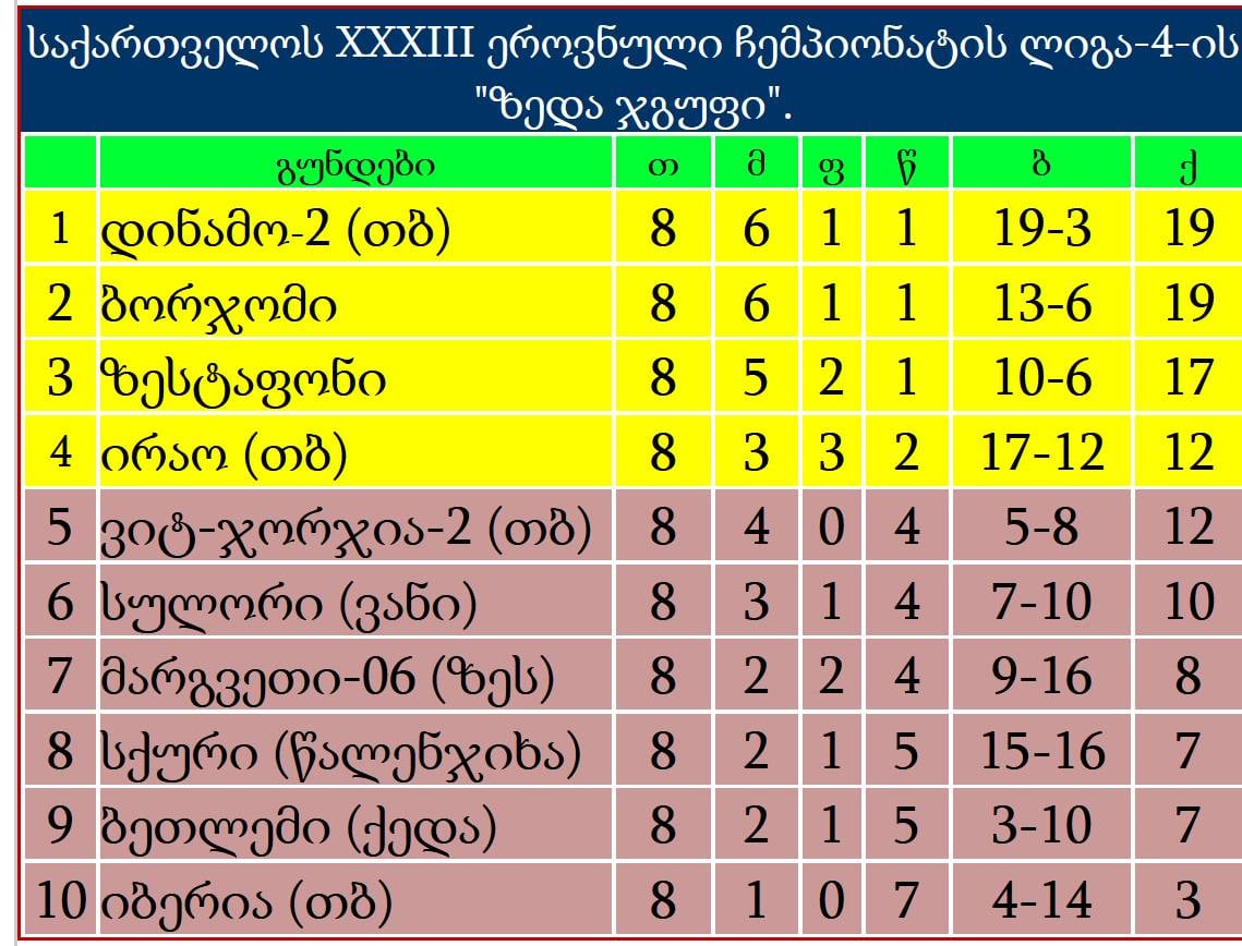 საქართველოს XXXIII ეროვნული ჩემპიონატის ლიგა-4-ის "ზედა ჯგუფის" სატურნირო ცხრილი ჩემპიონატის მეორე ეტაპის დაწყების წინ...
