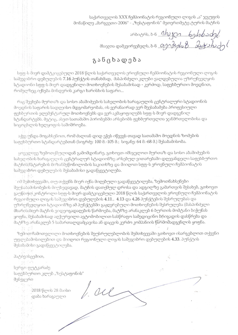 აქვე შეგახსენებთ, რომ მორიგ შეხვედრას ჩვენი გუნდი 28 მაისს გამართავს - ამ დღეს, ჩემპიონატის პირველი ეტაპის მეორე წრის სასტარტო შეხვედრაში, "ზესტაფონი" თანაქალაქელ საფეხბურთო გუნდ "მარგვეთი-2006"-ს დაუპირისპირდება...