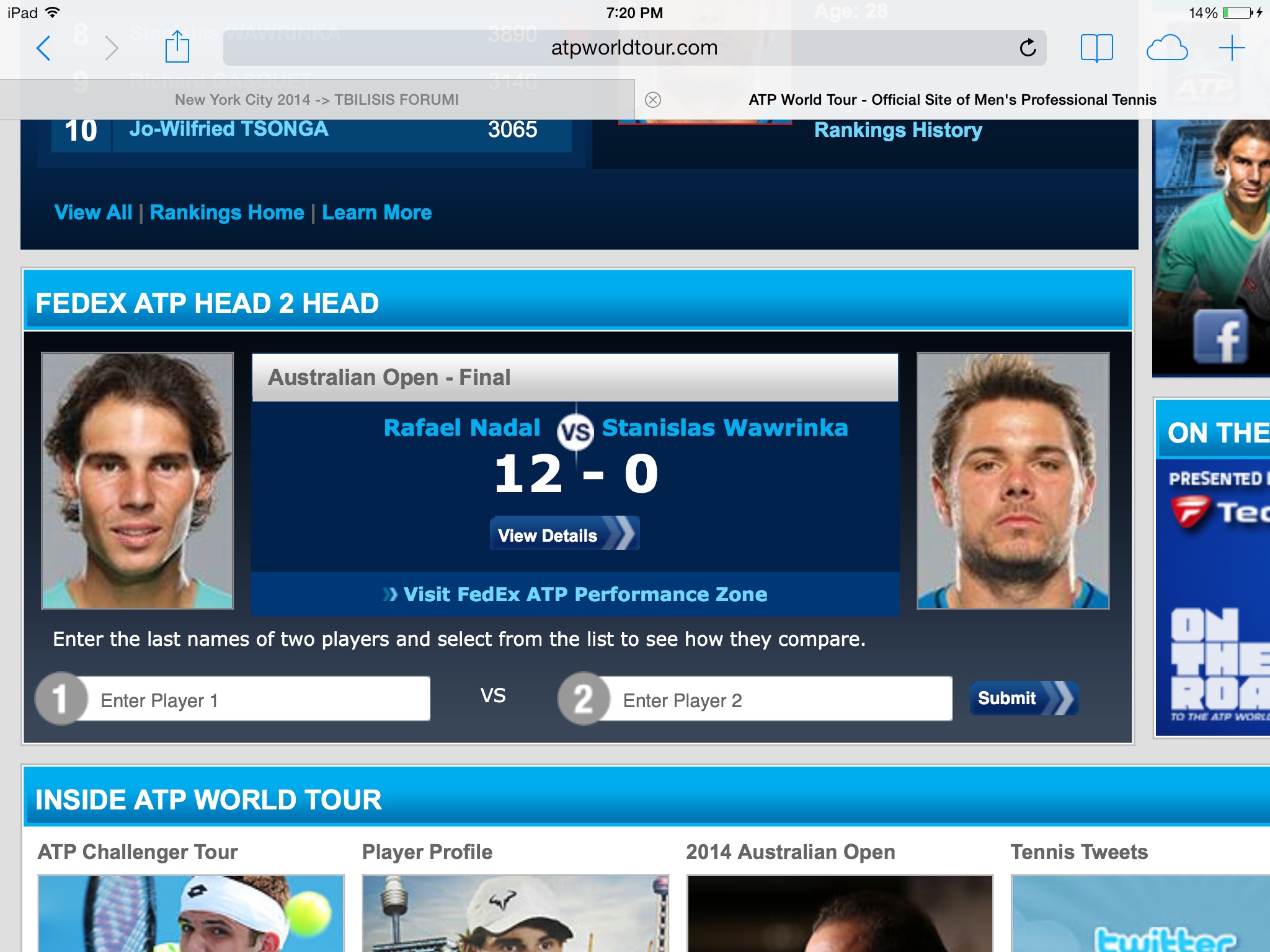 ისე ვავრინკასკენ კი ვარ, მაგრამ ამ სტატისტიკის შემხედვარე დიდი იმედი არ მაქვს... თან ნადალის თამაშის სტილს ვავრინკა ცოტა რთულად ეწყობა და კიდევ ნადალს ფინალებში თამაშის გამოცდილება უფრო დიდი აქვს (ძალების სწორად გადანაწილება და რამე) კიდევ უამრავი სხვა ნიუანსია.