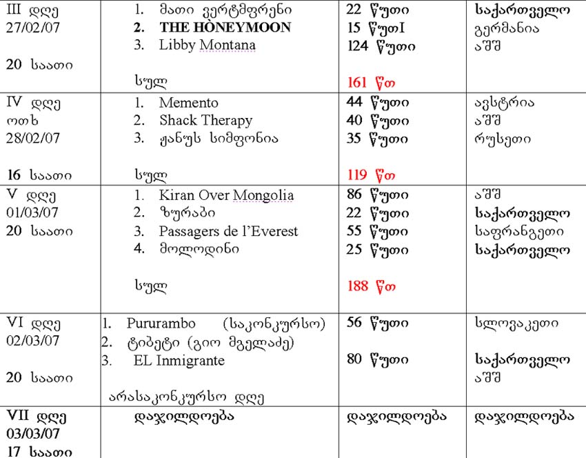 სამთო, სათავგადასავლო და ექტსრემალური სატელევიზიო ფილმებების ფესტივალი "ნიამორის" საკონკურსო ფილმების ჩვენების განრიგი: