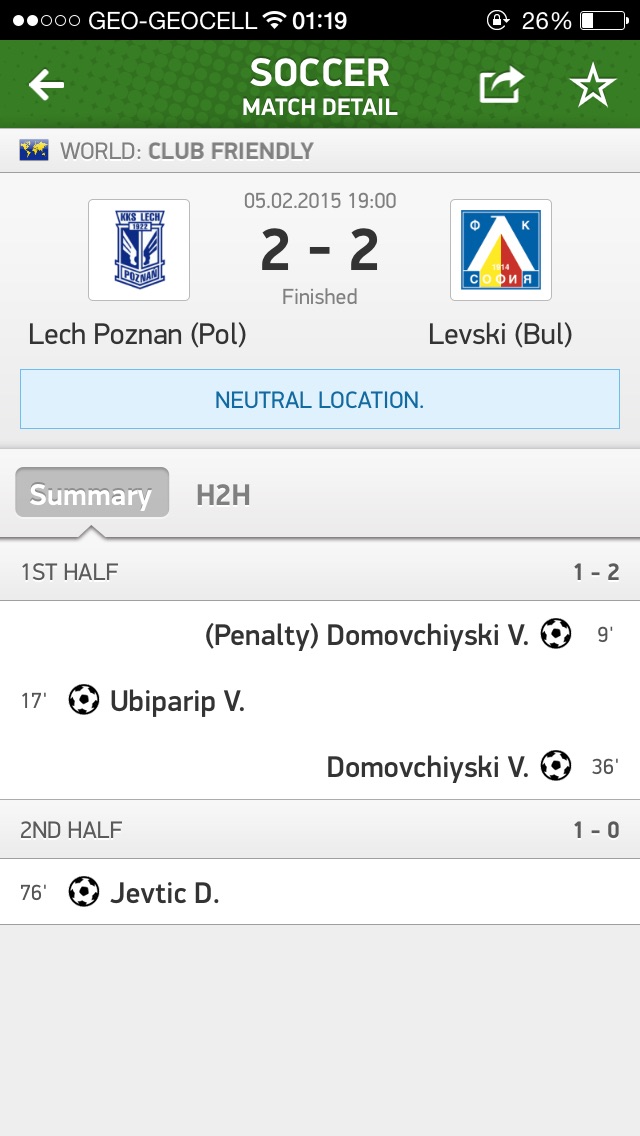 გოლები: 1:0 რუდნევსი (56), 2:0 არბოლედა (66), 3:0 შლუსარსკი (72), 4:0 რუდნევსი (73), 5:0 სტილიჩი (78)