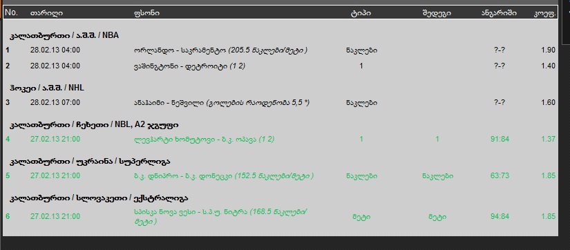 # 614-11206 გოლდენ სტეიტი. - ტორონტო 2013-03-05 07:30 125:118 ძირითადი : 1 1.35 მოგებული