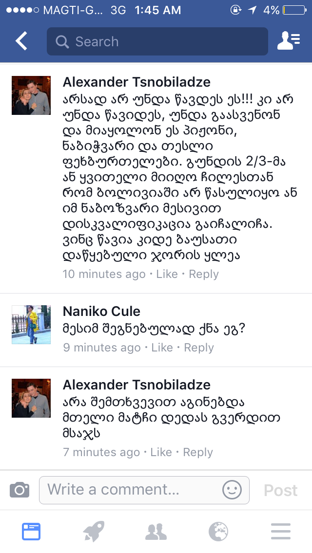 პ.ს. მარა, ამ სირს ხო ბედი არ აქვს (ვალენსიასთან მიღებული ყვითლის რ იყოს, მსაჯმა რაპორტში არ შეიტანა და შეიძლება გრანადასთან არ მოუწიოს გამოტოვება) ხოდა, არც ეს დედისპროჭის გინება შეუტანია რაპორტში, ხოდა დაუკავშირდა ალექსისას და უთხრა მიდით, ჩილეს მხარეს მიამართინეთ ფიფაზე საჩივარით, რომ დამსაჯონო. ეს მაფიოზა ტრაკი ეს!