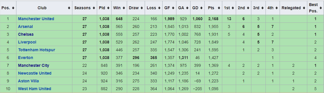 პრემიერლიგის ოლლ ტაიმ ტეიბლში არსენალს ვეწევით მალე მეორე გუნდი გავხდებით
