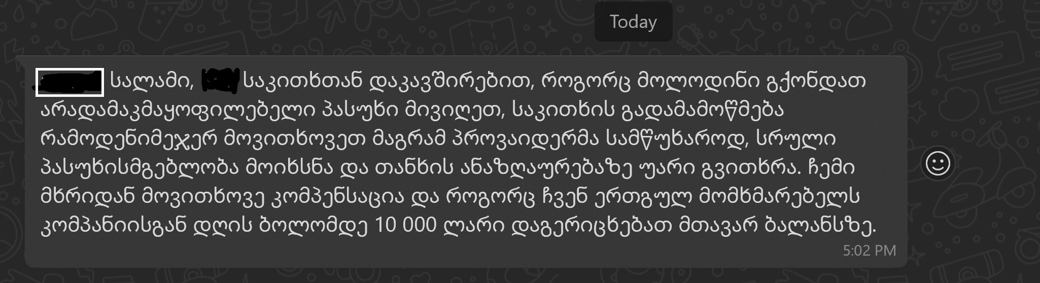 ესეიგი ერთ-ერთ ონლაინ კაზინოში ვთამაშობდი, გარკვეული ბონუს რაუნდები მოვაგროვე, რომელთა ჯამური ღირებულება მერყეობდა 30.000 ლარიდან 200.000 ლარამდე, ამ დროს ერთ-ერთმა სერვისის მიმწოდებელმა პროვაიდერმა დაიწყო ტექნიკური განახლება, რის შემდეგაც გამიქრა ეს ბონუს რაუნდები, ნუ მე ჩემი მხრიდან პირდაპირ კაზინოს მივმართე და საკითხი დავუფიქსირე, ისინიც დამთანხმდნენ, რომ ბონუს რაუნდები დაკარგული იყო და მოსთხოვეს ამ პროვაიდერს პასუხი, თუმცა პასუხი იყო არადამაკმაყოფილებელი და პროვაიდერმა ყველანაირი პასუხისმგებლობა მოიხსნა. მიღებული პასუხის სქრინშოტი შეგიძლიათ ნახოთ;