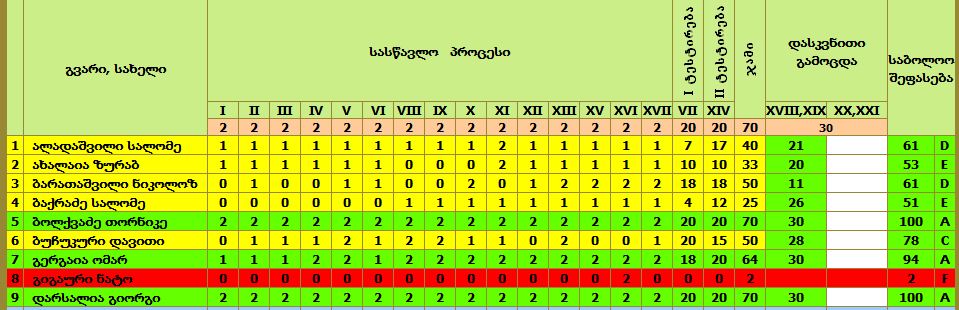 18 კვირას ვსწავლობთ 15 კვირა ეს 30 ქულა .... მერე 2 შუალედური 40 ქულა და გამოცდაც 30 და გამოდის 100....