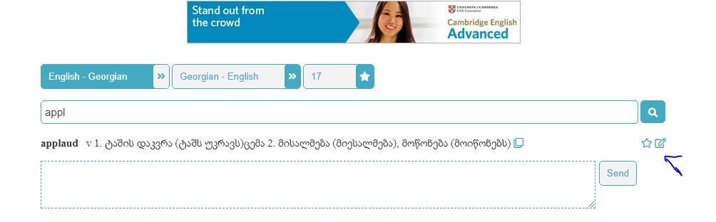 "პირიქით უნდა თარგმნიდეს, მაგ. ჩავწერე ASS გადათარგმნა საჯდომი. მერე ჩავწერე საჯდომი ქართულად და ინგლისურად როგორც წესი აღარ თარგმნის ხოლმე. " იქვეა მითითებული რომ ჯერჯერობით არ არის ჩატვირთული ქართულ-ინგლისური ვერსია, თუმცა ქართული სიტყვის თარგმანი კონტექსტის მიხედვით შეიძლება მოიძებნოს.