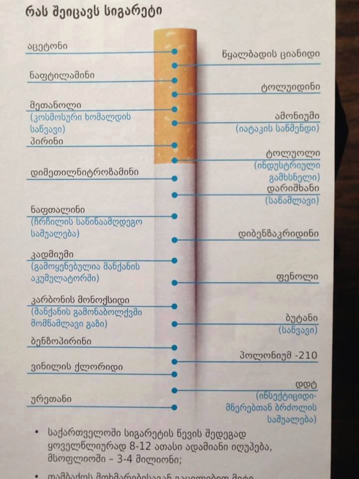 სიგარეტზე საუბრისას კი, მხოლოდ სამ შემადგენელ ნაწილს ახსენებენ: ნიკოტინი, ფისი და ნახშიროჟანგი
