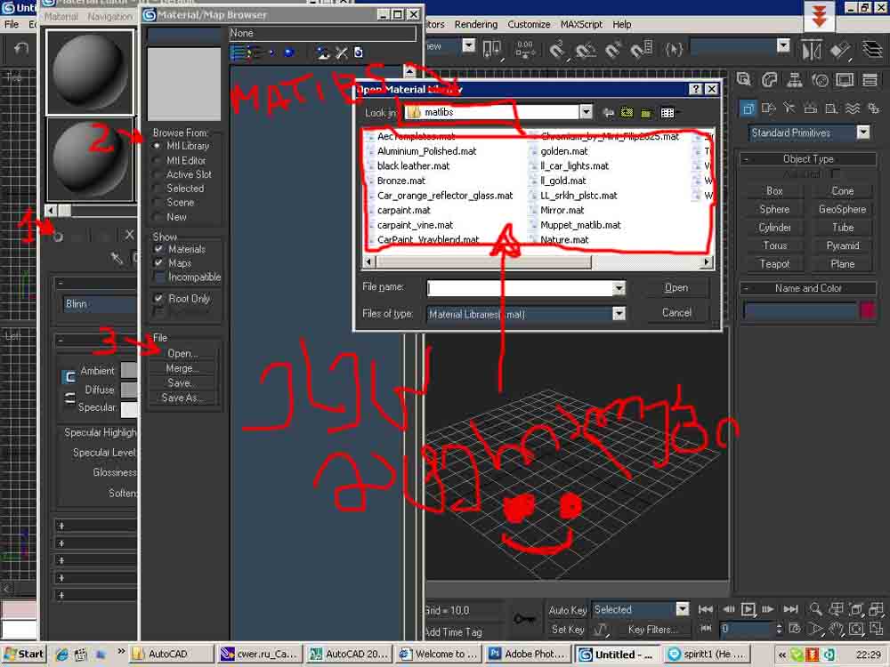 ჯერ მზა მატერიალი ჩააგდე პაპკაში c:/program file/autodesk/3dmax/matibs და მერე...................