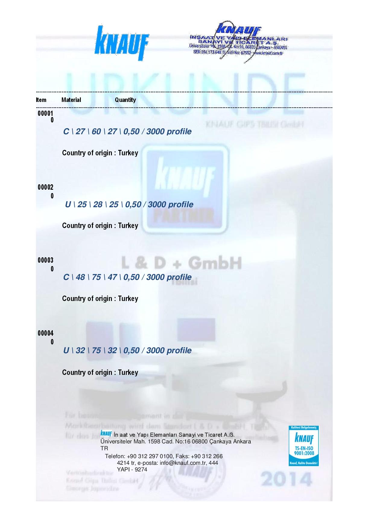 „კნაუფ ინსულეიშენ“_ის პროდუქცია მზადდება ბუნებრივი მასალისგან, წარმოება ხდება მაღალტექნოლოგიური თანამედროვე მოწყობილობების გამოყენებით.პროდუქციამ გაიარა ყველა საჭირო ტოქსიკოლოგიური და რადიოლოგიური კვლევა პროდუქტი უსაფრთხოა ჯანმრთელობისა და გარემოსათვის, რაც დასურდება რუსეთის სანიტარულ-ეპიდემიოლოგიური დასკვნებით და ორგანიზაციისს EUCEB (European certification board of mineral wool products) საერთაშორისო სერთიფიკატით. საერთაშორისო სერტიფიკატი ადასტურებს „კნაუფ ინსულეიშენ“_ის პროდუქციის შესაბამისობას ევროპულ დირექტივასთან NK8340 :