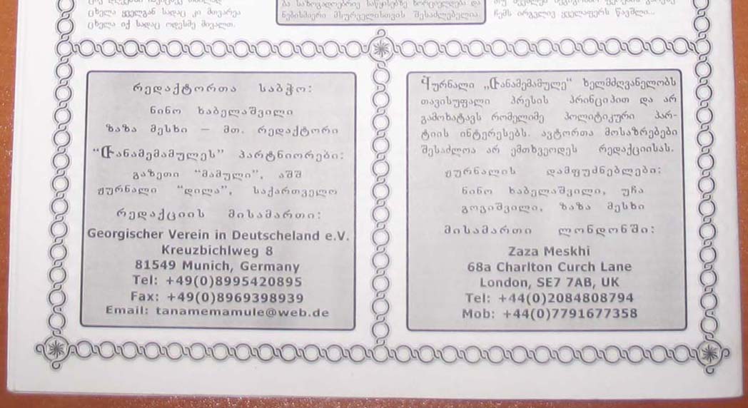 ფოტოაპარატი ეხლა თან არ მაქვს, რომ სურათები გადავიღო და დავპოსტო, საკმაოდ კარგი და ინფორმაციული 32 გვერდიანი A4 ფორმატის შავ-თეთრი ჟურნალია, გათვლილია სხვადასხვა ქვეყნებში მიმოფანტულ ჩვენს თანამემამულეებზე და amigo-ს, საბუნიას და ჩემი ნაცოდვილარიც კია გამოქვეყნებული!