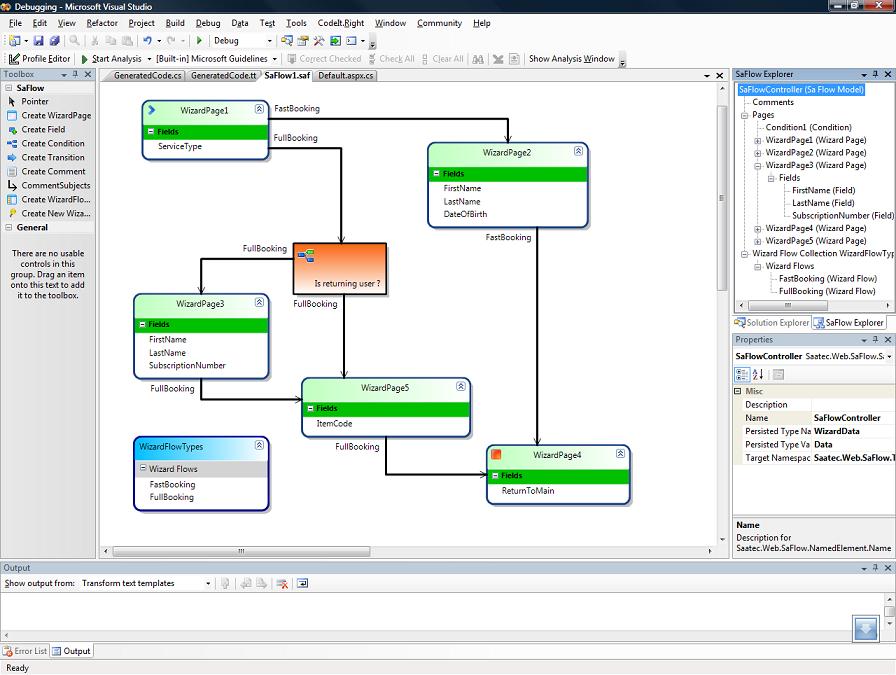 გარდა XML სტრუქტურის შიგთავსის მქონე ფაილის, გენერირდება ყველა დიაგრამაზე არსებული ელემენტების, მათ კავშირების შესაბამისი კლასები წინასწარ განსაზღვრული ფორმატით.