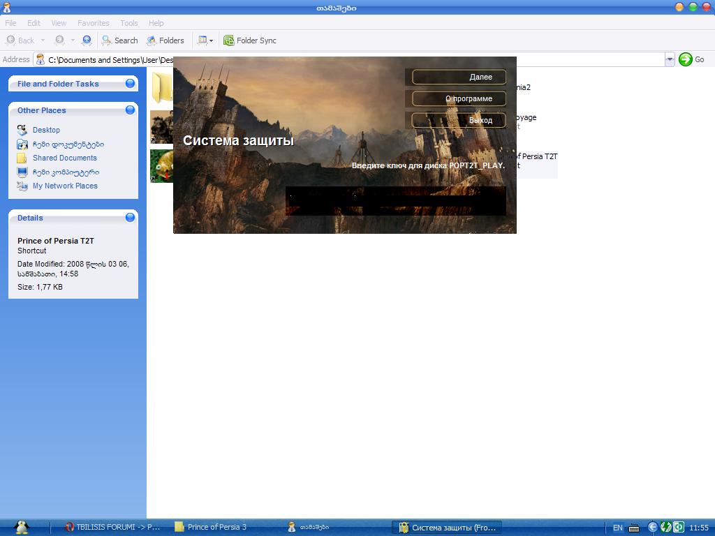 ესეიგი ჩავიწერე Prince of Persia T2T იგივე The Two Thrones ხო მგონი ხოდა რო ვრთავ არ ირთვება რაღაც cd key უნდა რომელიც ვერსად ვერ ვიპოვე ან კრეკი! გადმოვიწერე აი აქედან-http://go.pirveli.ge/index.php?newsid=1126 იქნებ დამეხმაროთ რა! ამ საიტზე კია კრეკი მაგრამ არ იწერს fast.ge-დან!