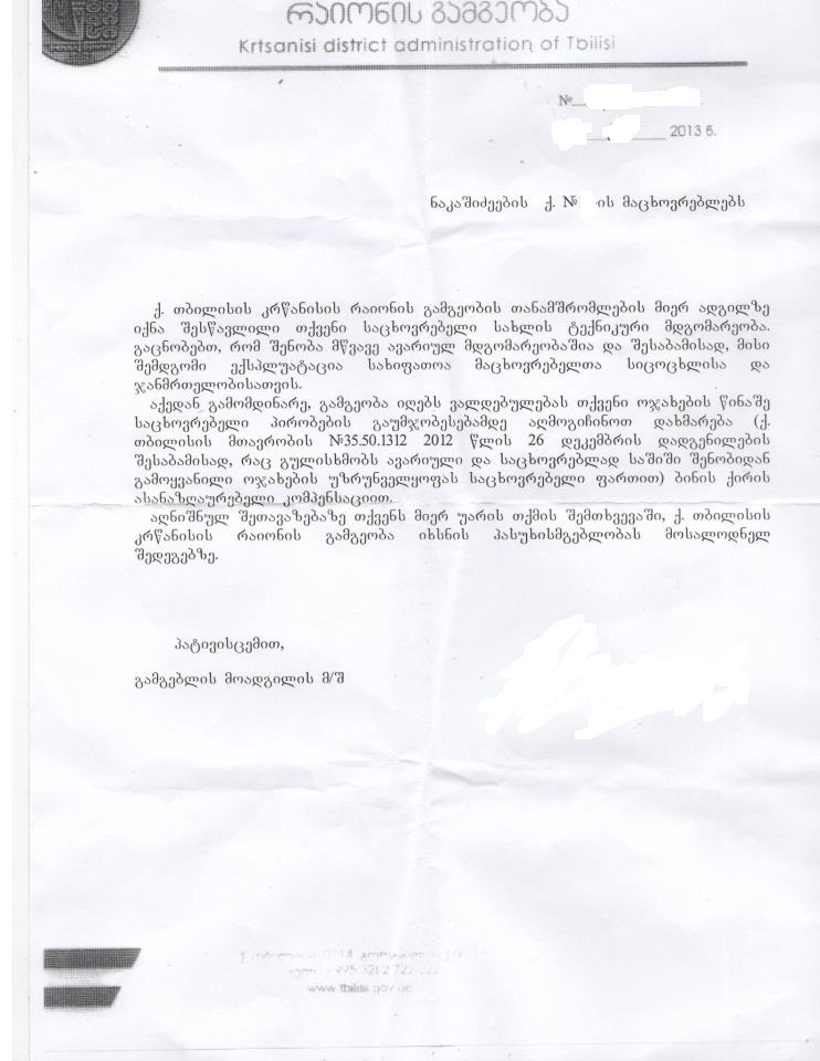 მოგვივიდა ეს წერილი გამგეობიდან. რას ფიქრობთ? არის შანსი რომ დაანგრიონ და ადგილზე ახალი ააშენონ ?