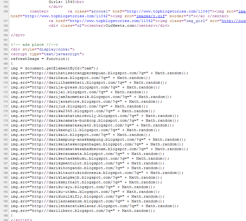 GeTto379ზუსტად ჩემი არა მარა ესეთი კოდი შევამჩნიე, დარეფრეშებისას ცვლის მისამართებს, ალბათ შემთხვევითად არჩევს მისამართებს მარა ისე საიტზე არ შემხვდა არსად ლინკები, თან ads place უწერიათ და ჩემი რატო უნდა მომხვდარიყო მანდ..