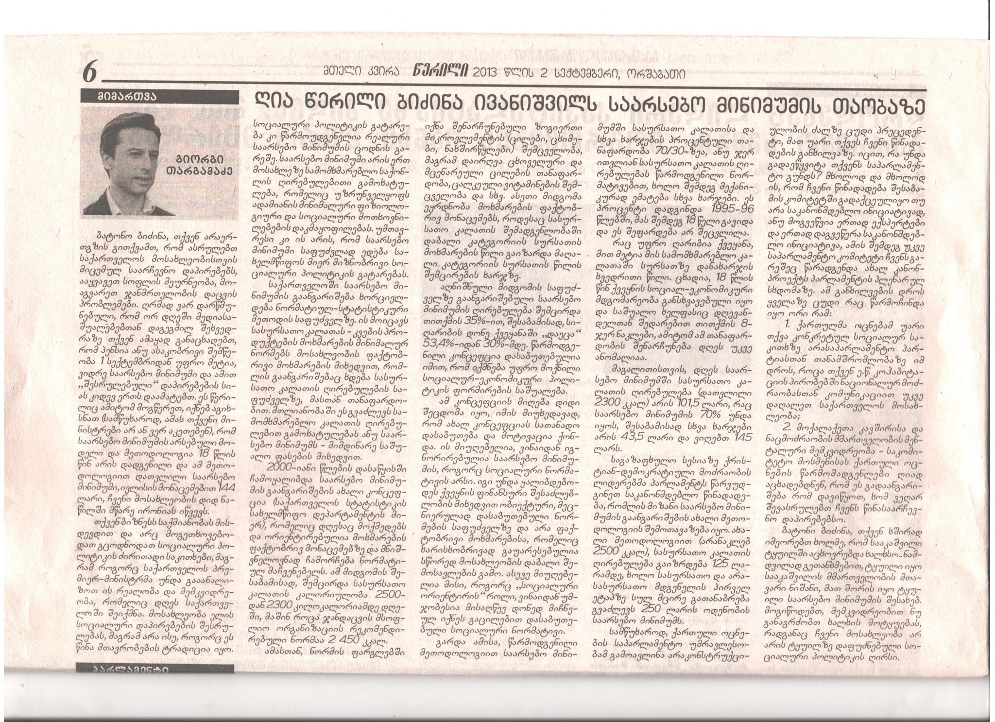 თქვენ ბიზნესს საქმიანობას მისდევდით და არც მოგეთხოვებოდათ გცოდნოდათ სოციალური პოლიტიკის ძირითადი საკითხები, მაგრამ როგორც საქართველოს პრემიერ-მინისტრმა უნდა გაანალიზოთ ის რეალობა და მემკვიდრეობა, რომელიც დღეს საქართველოში შეიქმნა. მოსახლეობა ელის სოციალური დაპირებების შესრულებას, მაგრამ არა ისე, როგორც ეს წინა მთავრობების ტრადიცია იყო. სოციალური პოლიტიკის გატარება კი წარმოუდგენელია რეალური საარსებო მინიმუმის ცოდნის გარეშე. საარსებო მინიმუმი არის ერთ მოსახლეზე სამომხმარებლო საქონლის ღირებულებითი გამოხატულება, რომელიც უზრუნველყოფს ადამიანის მინიმალური ფიზიოლოგიური და სოციალური მოთხოვნილებების დაკმაყოფილებას. უმთავრესი კი ის არის, რომ საარსებო მინიმუმი საფუძვლად ედება სახელმწიფოს მიერ მიზნობრივი სოციალური პოლიტიკის გატარებას.