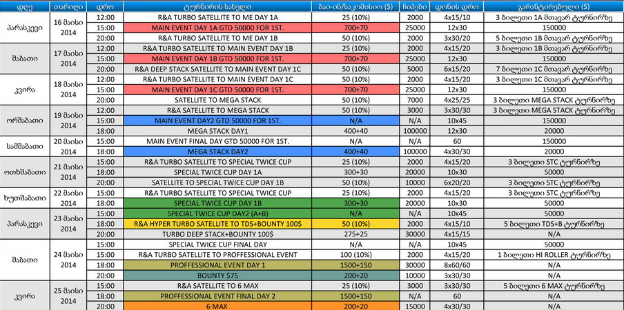 ჩატარდება არაგეგმიური ივენთებიც: ჩინურ პოკერში, ომაჰაში, მიქსტ-ტურნირი, ერთ და ორმაგიდიანი ტურბო-ფრიზაუთები. გაიხსნება არანაკლებ 10 ქეშ-მაგიდა...