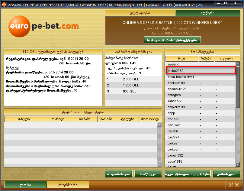 8 ივნისს იყო პირველი ეგეთი ტურნირი,და 15 ივნის ჩატარდება მეორე.ვიყავი პირველ ტურნირზე 45 კაცში გამოვარდი მე 12 საპრიზოში ვერ მოვხდი და რატო ეხლა აგიხსნით ჯერ ერთი რო დავრჩით 2 მაგიდა 1 მაიდაზე იჯდნენ და ბლაინდებს ატანდნენ სულ ერთმანეტს არ ეთამაშებოდნენ რაც ნებისმიერ ევროპულ ქვეყანაში არის დაუშვებელი და ჩემს მაგიდაზე იჯდნენ 3 ადამიანი ასევე ერთმანეტს არ ეთამაშებოდნენ QQ ეჭირათ და ჩეკებით მიდიოდნენ რივერამდე,და ერთ ერთ დარიგებაში დილერს შეეშალა დათვლაში ალლ ინ გავქოლე დილერმა დამითვალა 14 000 აქვს სტეკიო და სინამდვილში 20 000 ხქონდა.თუ არის აქ ევროპა ბეთის წამომადგენელი მიხედეთ ამას !!! სურვილს უკარგავთ მოთამაშეებს მივიდნენ თქვენ პოკერ რუმში!!!