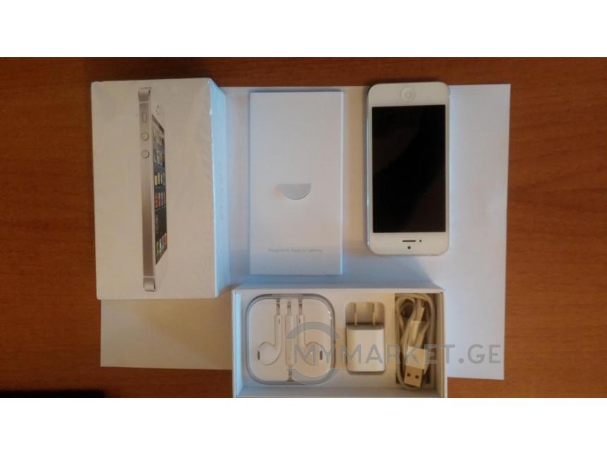 იყიდება თეთრი iPhone 5 64გბ, მოყვება ყუთი (იმეი ემთხვევა), დამტენი და ყურსასმენები. კოდმოხსნილია უპრობლემოდ მუშაობს. კანტებზე აქვს დაზიანება, ეკრანი და უკან უნაკაწროა.