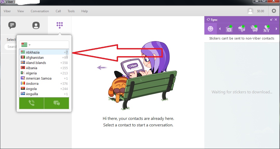 დააყენეთ ბატონო ვაიბერი კომპიუტერზე და დაიწყეთ კონაკტების ძიება და ქვეყნების ჩამონათვალში პირვლივე